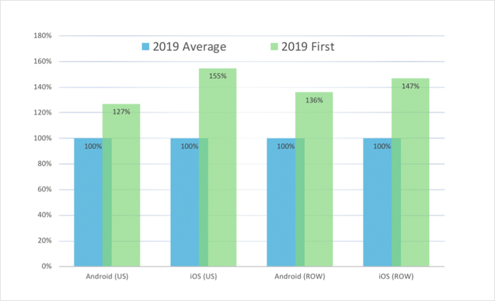 Here, you can see the chart where the difference between the 1st impression eCPM and the Q1 2019 average eCPM received per platform which is further compared with the benchmark of Q1 2018. The information is depicted in the graph where the average impression of eCPM is 100% and the first eCPM impression will be presented in comparison.