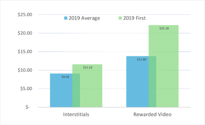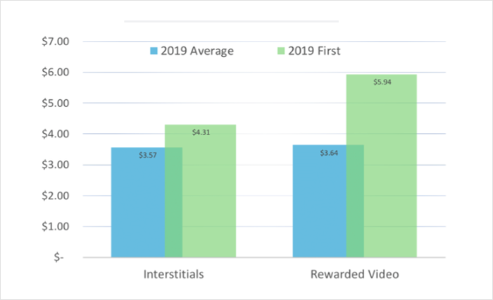 Through this section, you will get a breakdown of the major ad types including interstitials and video interstitials Vs. rewarded video stats. You’ll also be able to get a go through to the respective average and 1st impression eCPM stats. Have a look at the below chart which is designed to display the average eCPMs gathered for each ad.