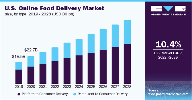 Se se espera que el tamaño del mercado mundial de entrega de alimentos en línea se expanda a una tasa de crecimiento anual compuesta (CAGR) del 10,4% de 2022 a 2028.